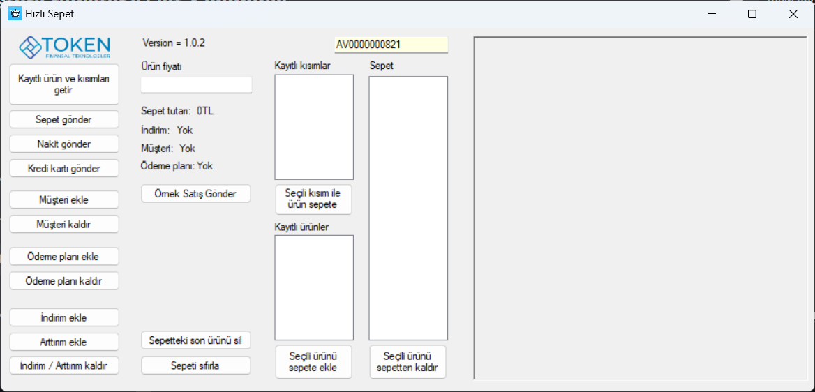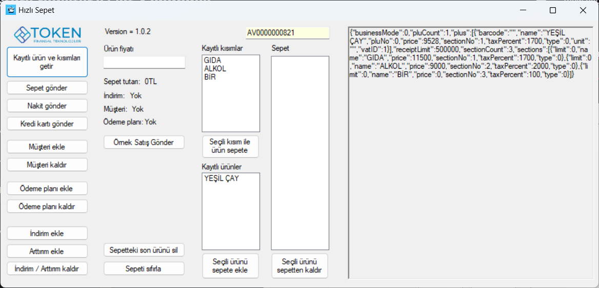 8. Kayıtlı ürün ve kısımları çektikten sonra sepete  fiyat ve kısım seçerek veya kayıtlı ürünlerden seçerek bir ürün ekleyin. Sepette ürün olduğundan emin olduktan sonra "Sepet gönder" butonuna basarak sepeti ÖKC'ye gönderip satışı tamamlayın ve satış tamamlandı bilgisinin döndüğüne emin olun.